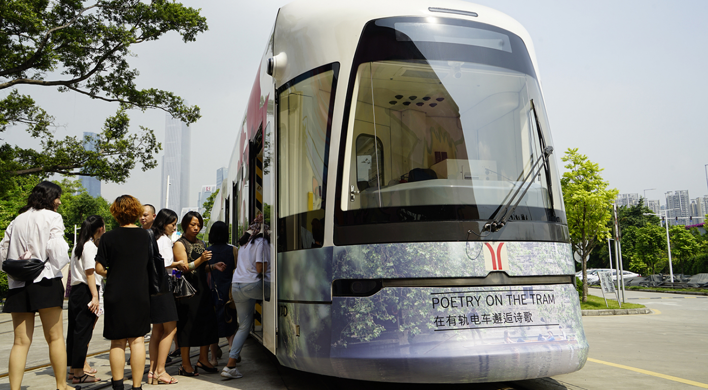 Poem video walls at 5 stations highlight 12 of the 40 poems, attracting passengers to stop and appreciate the works. In Guangzhou, tram cars decorated with poetry-themed displays run along the Pearl River, and at Pati Station there is a poetry themed glass corridor showcasing 15 Chinese and British poems.