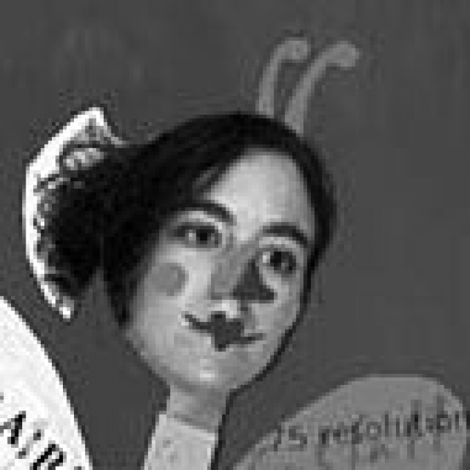 In her more recent works, we see her experimenting with more text and new techniques, such as collage, and we detect a very personal style emerging. As before, she usually works on coloured backgrounds, but in much more subtle colours, such as ochre, misty blue or orangey red, often using pieces of paper torn from exercise books, graph paper and wallpaper, frequently stained or marked in some way. On these backgrounds she sticks fragments cut from photographs – eyes are a common motif, as are pictures of herself as a child – pieces of fabric, details seemingly randomly cut from prints of old masters, music and snippets of newsprint, often mixing print in several languages including English, Italian, French and even Chinese. She flirts with different typefaces, superimposing pieces of print on top of her illustrations, or using them as part of a drawing – the body of a butterfly, for example. The use of historical typeface, such as pieces giving price tags in old pounds, shillings and pennies, give an old-fashioned look to the work and hint of influences from Duchamp and other Dadaists. She often draws or prints in black ink on top of these collages, using doodle-like scribbles, which pull the focus of the work back from the adult world to the realms of childhood.